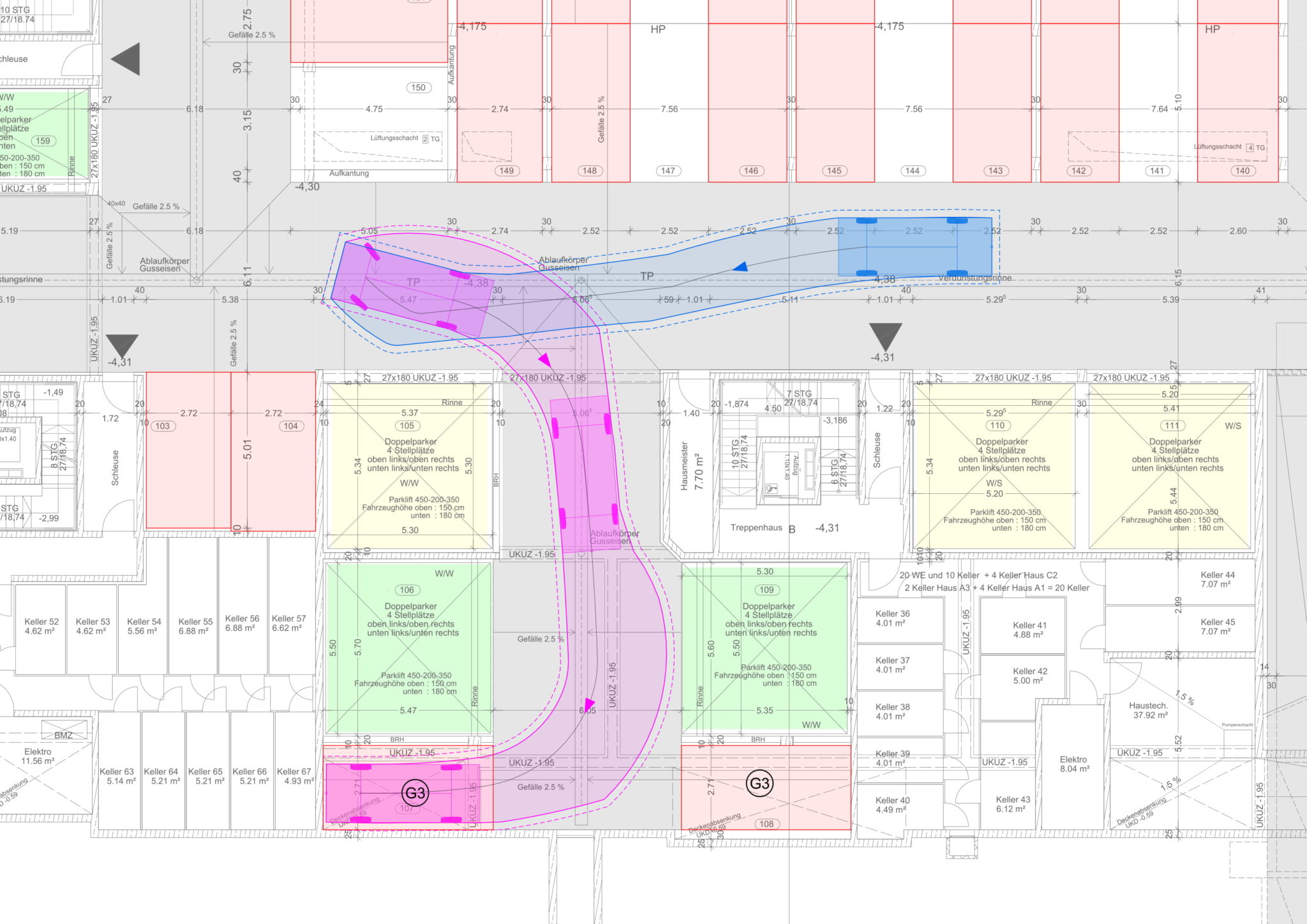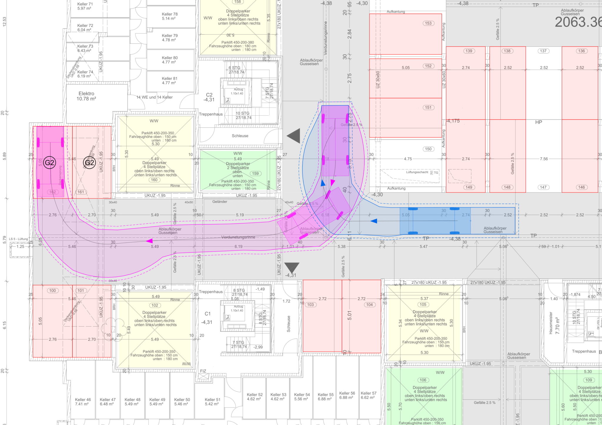 Die Studie befasste sich mit der Prüfung der Fahrgeometrie, sowie der Ein-, und Ausstiegsverhältnisse der Tiefgaragenstellplätze inklusive Duplexstellplätze.
