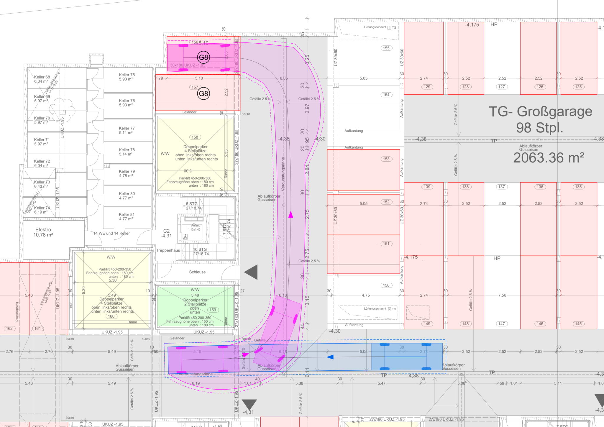 Studie zu Tiefgaragenstellplätzen mit Schleppkurven